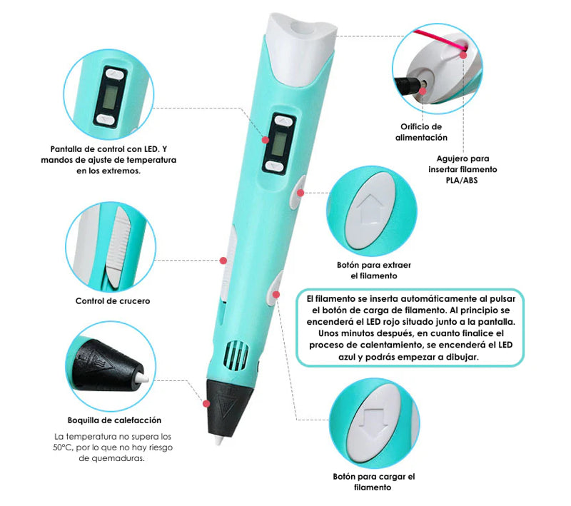 Nuestro bolígrafo 3D es compatible con filamentos PLA y/o ABS. El PLA es el más recomendado para niños y principiantes por ser más seguro y fácil de manejar.